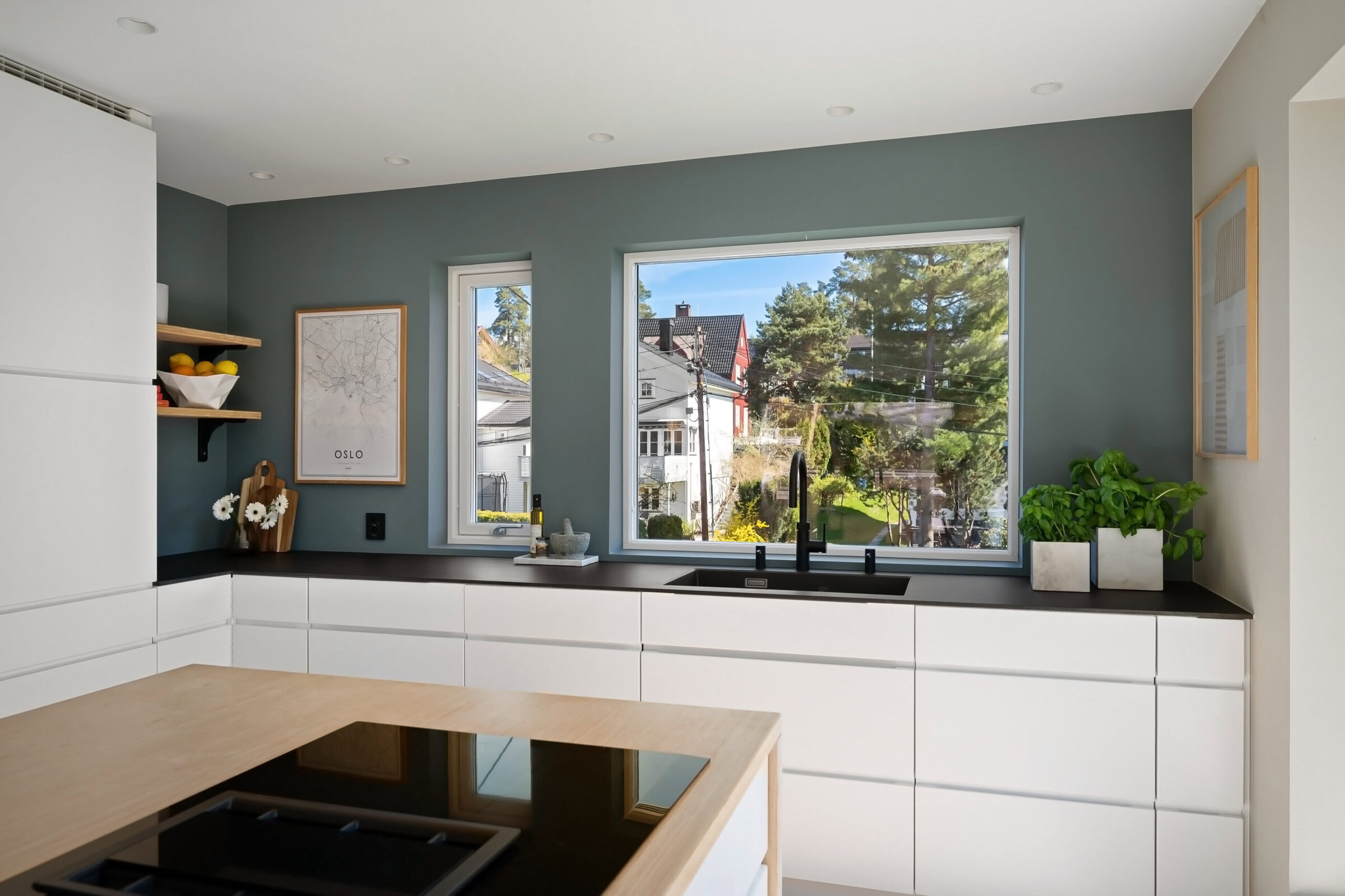 InPlace tegnet ny planløsning tilpasset den endrede familiesituasjonen, kom med forslag til nytt kjøkken, både løsning, fronter, benkeplate etc. Utarbeidet belysningsplan, fargeplan og en plan for begge bad og et toalettrom, med fliser, innredning etc.
