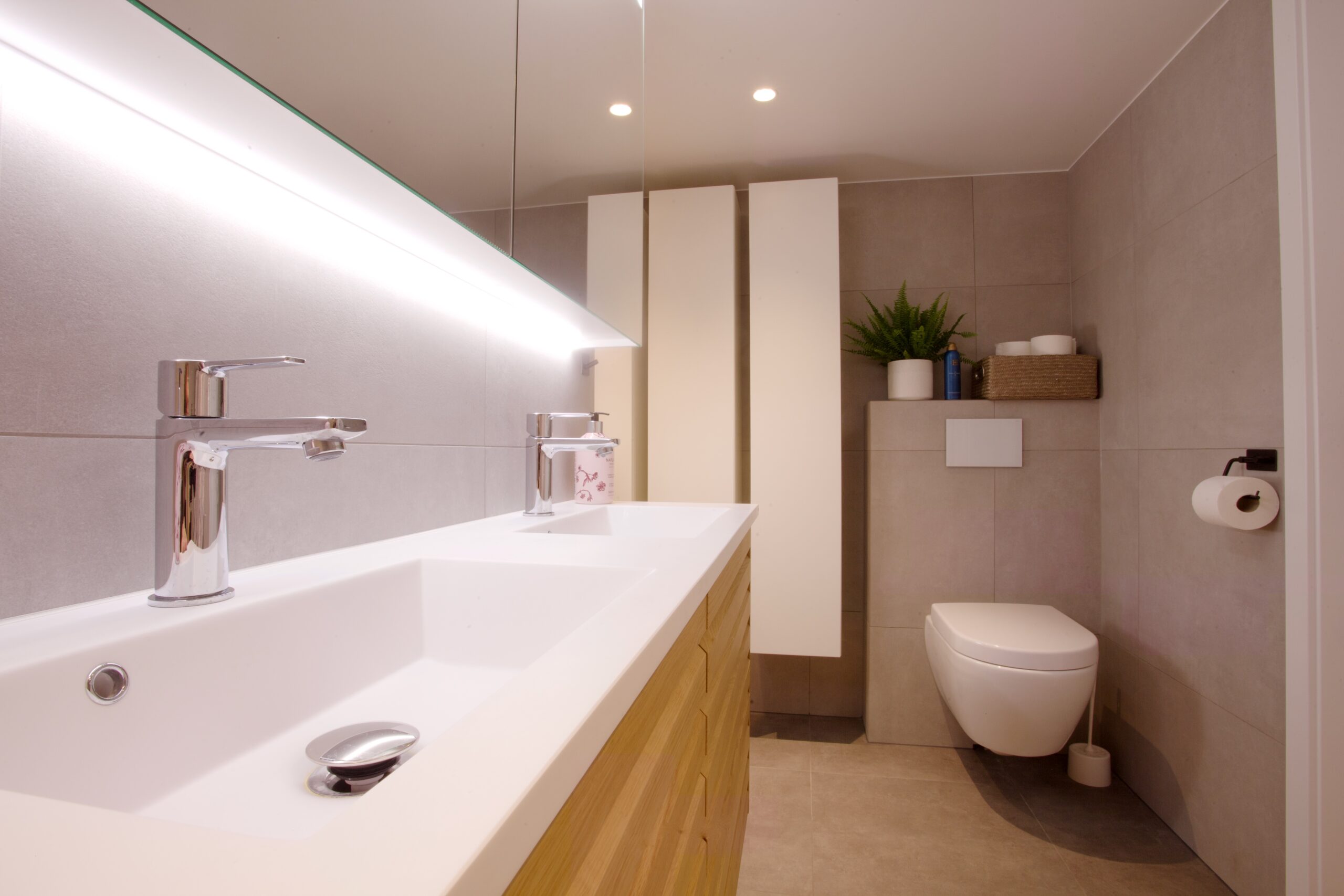 Og sånn ble det. InPlace lagde en plan for begge badene, med en tilhørende vaskeromsdel som fikk luke til skittentøy inn bak et hengslet speil på barnebadet, slik at man slipper å gå hele veien rundt.